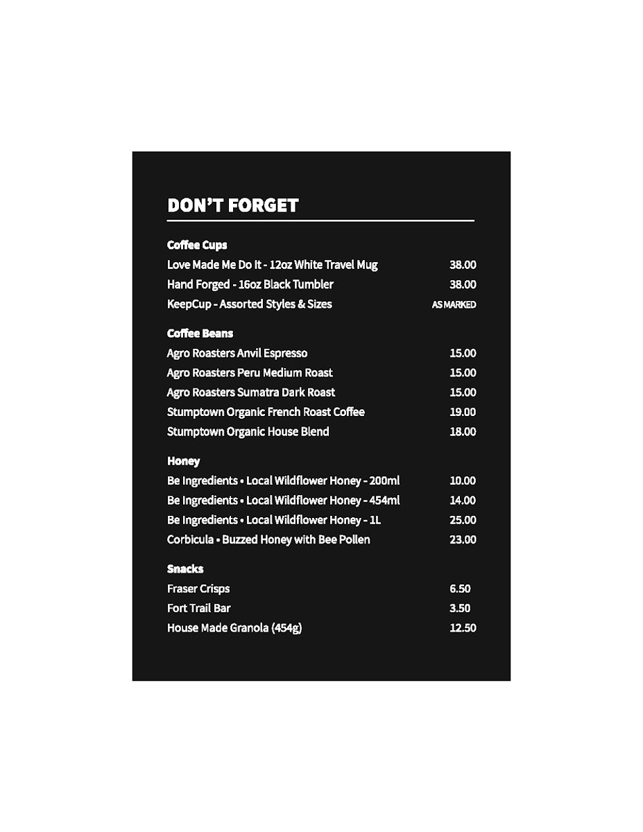 Wrapping up my visit to Blacksmith Bakery At Langley Airport (5385 216 St #115, Langley Twp, BC V2Y 2N3, Canada), the menu feels like a carefully curated mix of café staples, bakery comforts, and a few thoughtful retail treats. For coffee lovers, there are lifestyle items like Love Made Me Do It - 12oz White Travel Mug and Hand Forged - 16oz Black Tumbler, plus a solid bean lineup including Agro Roasters Anvil Espresso, Agro Roasters Peru Medium Roast, Agro Roasters Sumatra Dark RoastStumptown Organic French Roast Coffee, and Stumptown Organic House Blend. If you’re after something quick to nibble, the snack options-Fraser Crisps, Fort Trail Bar, and House Made Granola-fit perfectly with a coffee run. The sandwich selection is the heart of the “grab-and-go” experience, featuring Breakfast Sandwich, B.l.t.a, Shrimp Salad CroissantEgg Salad Croissant, and Smoked Turkey-all sounding like satisfying, no-fuss choices for travelers or locals on the move. Drinks are also well covered with bottled picks like Gooddrink Iced Teas, Goodwater, Boylan SodaGooddrink Organic Spritizters, Stumptown Cold Brew, and a cookie case that adds real charm: Dark Chocolate (Gf) Cookie, White Chocolate Cranberry Cookie, Shortbread CookiesKids Cookie Necklace, and Pa-Moja Rhino Cookie. To round it out, the “extras” section-Be Ingredients. Local Wildflower Honey - 200ml, Be Ingredients. Local Wildflower Honey - 454ml, Be Ingredients. Local Wildflower Honey - 1lCorbicula Buzzed Honey With Bee Pollen, and a Plain Croissant-gives the menu a cozy, artisan-market feel, making it easy to leave with something tasty now and something special for later.